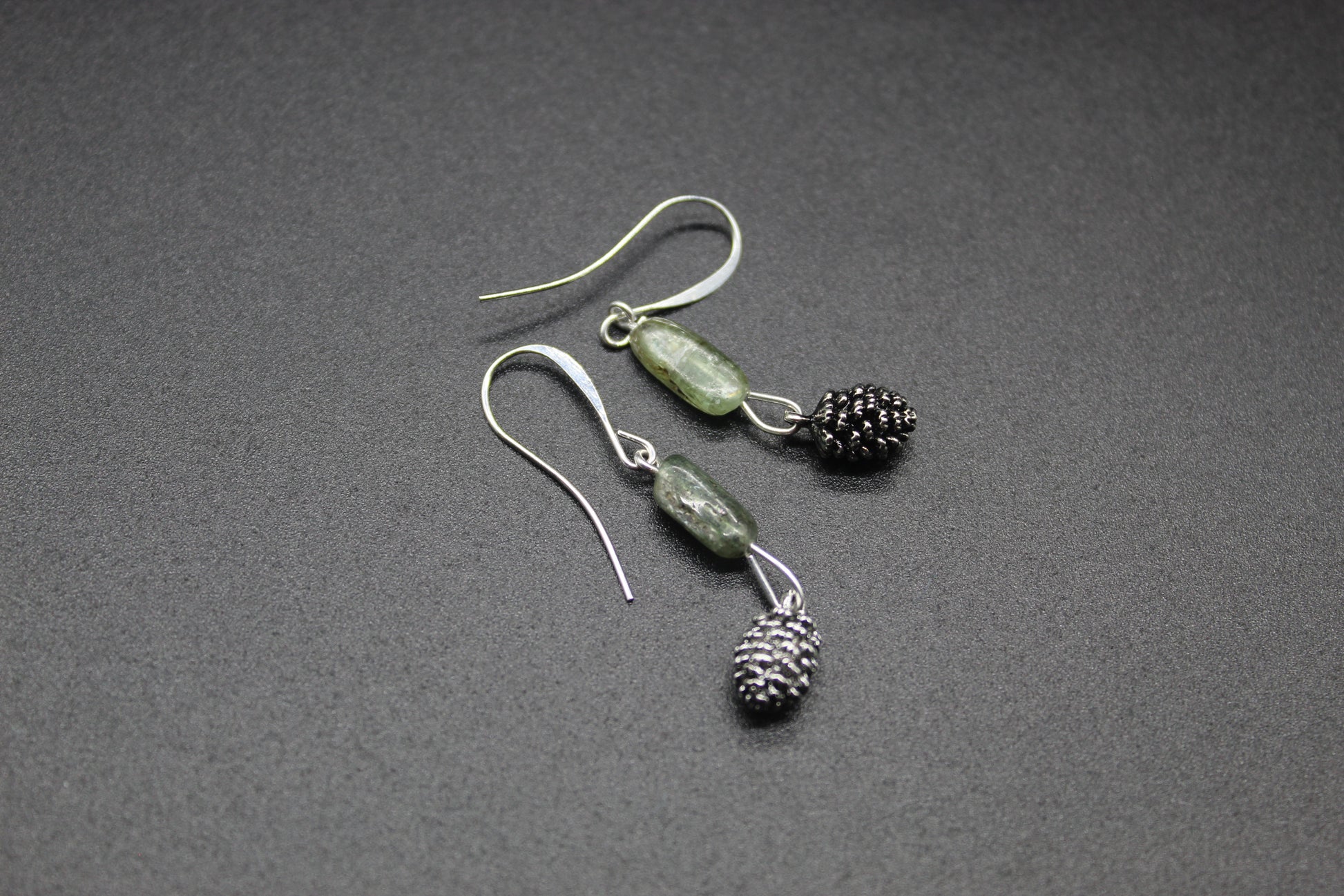 Silver Pine Cone and Green Kyanite Gemstone Earrings
